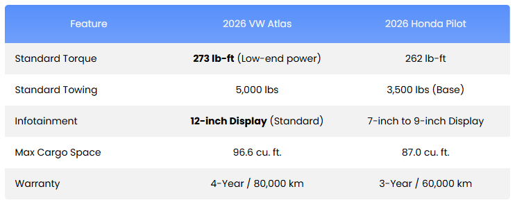 Choosing the right 3-row SUV in Kingston means finding a vehicle that handles Highway 401 commutes, weekend trips to the 1000 Islands, and unpredictable Ontario winters with ease. At Kingston Volkswagen, we know that the 2026 Volkswagen Atlas and the Honda Pilot are top contenders. While both offer space and reliability, the Atlas delivers a level of German-engineered torque, interior flexibility, and standard technology that the Pilot simply can’t match.